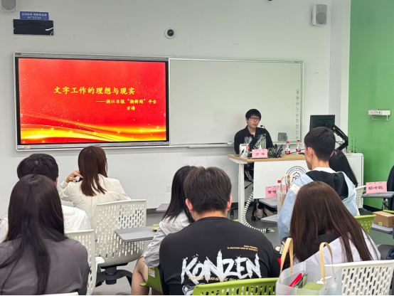 人才培养、学生的自我锻炼、创作需要注意的事项等方面提出了意见和建议。作为本次大赛的评委,他有针对性地对同学们的作品作了评价,提出了进一步修改提高的建议。讲座过程中,他还与同学们就创作、就业等话题进行深入交流,鼓励同学们利用闲余时间积极锻炼自己,勇于尝试,挖掘自己在文字工作方面的兴趣与热爱,把握每一个自我提升的机会,丰富自己的实习经历。