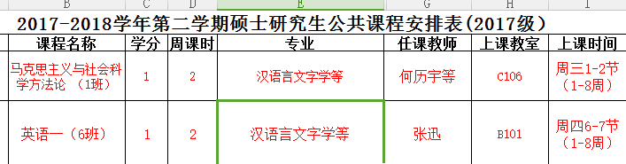 另附汉语言文字学研究生公共课课表截图: