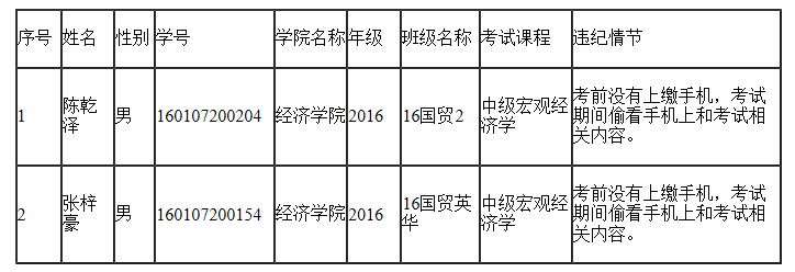 2018年6月25日的课程期末考核中,成人韩漫 共有2位同学在考试中违纪,名单如下: