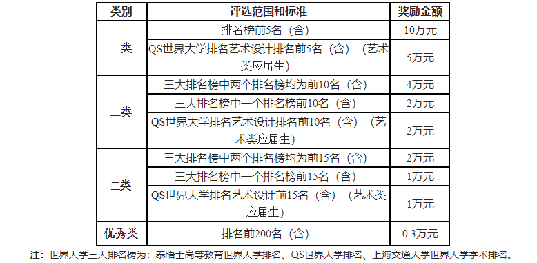 国(境)外奖学金用于资助学生通过自主申请赴海外名校攻读研究生。根据学生录取高校在世界大学三大排名榜中的综合排名,名校研究生奖学金分“一类”、“二类”、“三类”、“优秀类”,评选范围和标准、奖励金额如下: