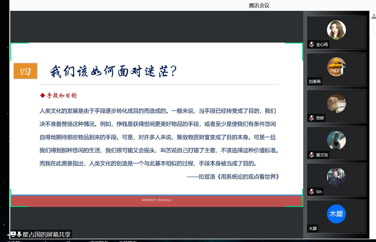 沙龙伊始,翟占国老师结合自身多年的研博经验,分享了他从迷茫到逐步明晰发展方向的心路历程。分享中,翟老师以严谨的学术态度和严密的学术思路,从迷茫的定义、特点、发生原因等多个方面层层递进地帮助学生认清迷茫的本质。翟老师指出,迷茫具有普遍性、阶段性和变化性,我们之所以会产生迷茫感,恰是因为我们正处于人生的转折期、瓶颈期或突变期。
