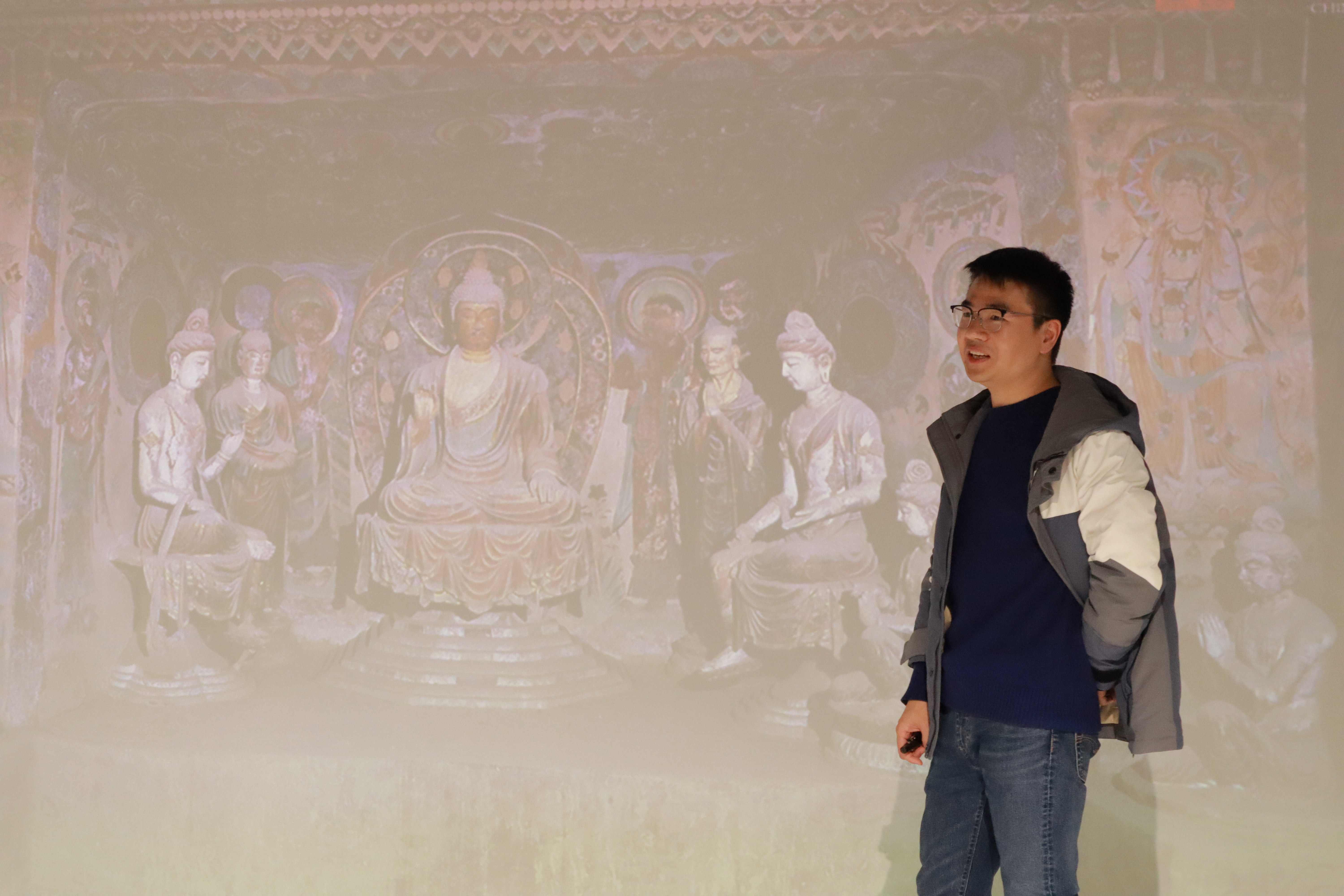 最后,徐老师借开始前分发的敦煌壁画明信片,细述 112 窟金刚经变典故,详解禅宗六祖身份;剖析 328 窟敦煌四菩萨壁画佛像身份布局,明辨迦叶与阿难;讲述 254 窟萨埵那太子舍身饲虎图。此诸般壁画所蕴舍身因果、舍身侍法之要义,砥砺无数敦煌守护者,使其于艰难困苦中坚守侍奉民族艺术瑰宝之信念,矢志不渝。