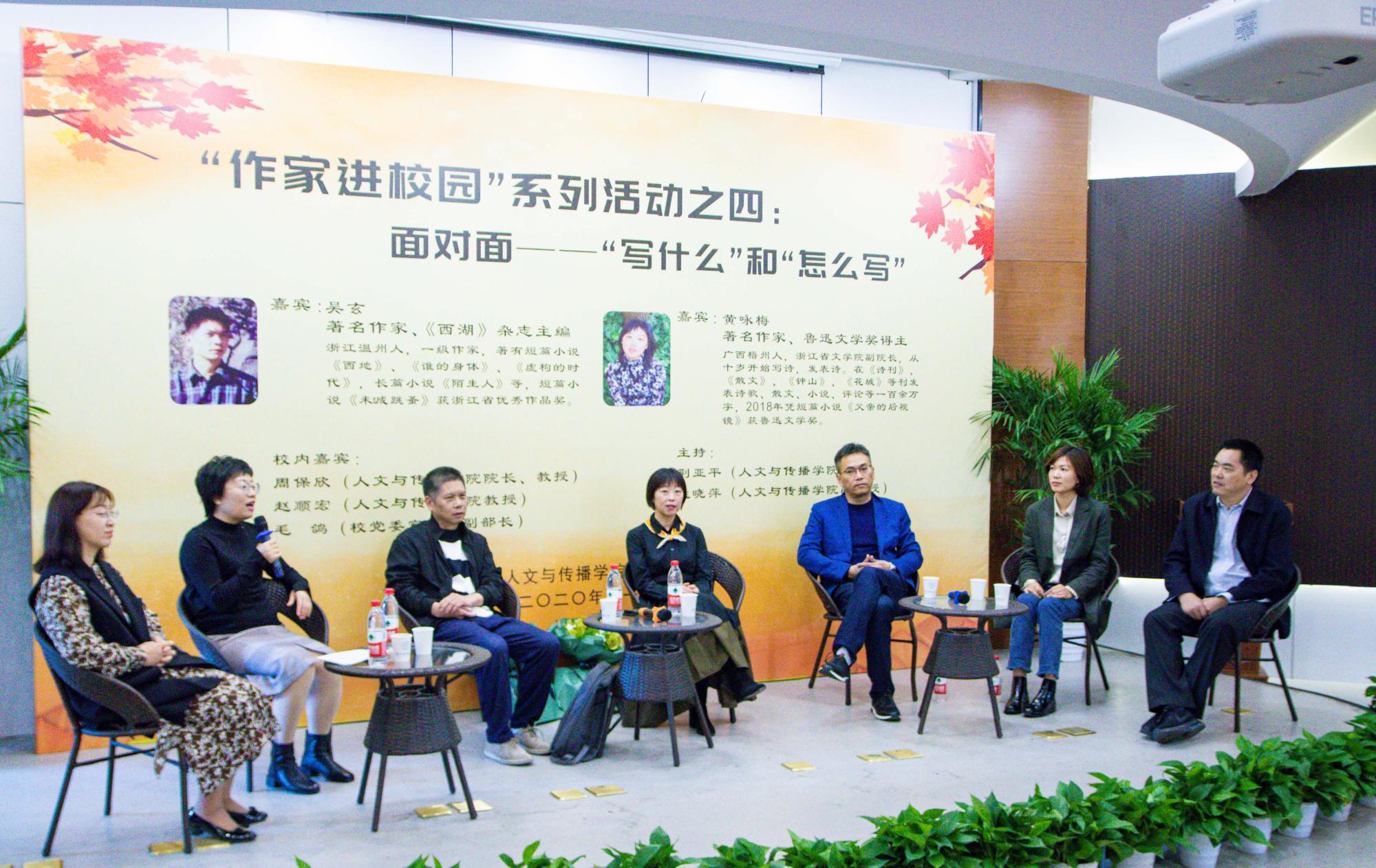 “作家进校园”系列活动之四:面对面—“写什么”和“怎么写”,在7号楼112报告厅举行。著名作家、《西湖》杂志主编吴玄,著名作家、鲁迅文学奖得主黄咏梅受邀莅临成人韩漫