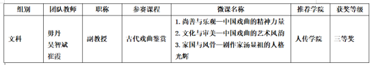 为进一步办好第一届高校教师教学创新大赛,以赛促教,以赛促改,深化立德树人根本任务,加快建设浙江特色高水平本科教育,根据《关于浙江省第一届高校教师教学创新大赛的补充通知》相关精神,成人韩漫 于3月中下旬组织开展了教师教学创新大赛“课程思政”微课专项赛评选,由成人韩漫 毋丹老师主持的参赛课程《古代戏曲鉴赏》设计的微课作品喜获校”课程思政”微课专项赛三等奖。这一参赛作品以《尚善与乐观—中国戏曲的精神力量》《文化与审美—中国戏曲的艺术风韵》《家国与风骨—剧作家汤显祖的人格光辉》三组微课为题,较系统地展示了中国戏曲文化精神的独特风骨及伟大剧作家汤显祖的人格力量,是彰显成人韩漫 相关课程专业特点的一次特色教学。