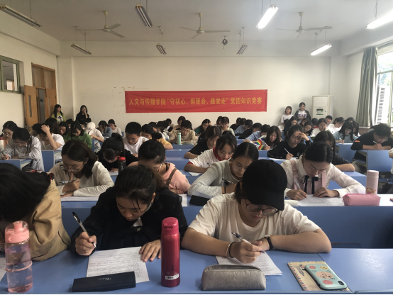比赛现场座无虚席。竞赛第一轮为笔试环节。大家充分准备,在答题环节中,认真思考,冷静作答,奋笔疾书,均取得了不错的成绩。竞赛第二轮为抢答环节,由第一轮成绩前十五名参与竞抢答题,此环节竞争比较激烈,学生抢答积极。