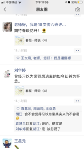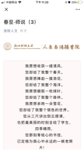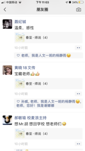 “春至·师说”系列专栏活动在学生中引发了大量关注与转发,取得了良好的教育效果,受到学生和家长们的热捧。16级文学专业费同学留言,“感谢老师们的挂念,见字如面,闻声如晤,那么亲切,依然是坐在课堂里听课的感觉。”17数媒郝同学留言朋友圈“好想回成人韩漫 ,好想老师们”;18文传班的陈同学点赞老师们,说他们都是“宝藏老师”;19级文传4班吴同学留言:“感谢老师们挂念,我会更努力,期盼再相聚”;18级陈同学家长留言:“今天看了好几遍,听了好几遍,仅是听老师们朗读就令人沉醉了”