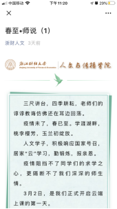疫情期间,成人韩漫 党委因势利导,发挥互联网新媒体传播优势,组织开展网络思政教育,发起“春至·师说”专栏活动,实现停课不停教,隔离不割爱。自3月2日起,该院先后邀请院内18位一线教师和院外5位社会导师过网络向学生们寄予真切关心关怀,共话学生成长,将老师们对学生的谆谆教导传递给居家学习的大学生们。截止3月9日,“浙财人文”公众号累计登载8期,累计点击率达5300多人次,成为该院大学生们每日一道成长“大餐”,收到了良好教育效果和社会反响。