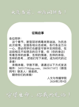 启动了“疫情之下,你我同书写共见证”征文活动,征稿启事发布后,学生们积极响应,截止2月20日,收到成人韩漫