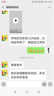 疫情带来了大不幸,也带来了师生、家校更多的交流和互动。2月9日下午,18文学陆郡益同学家长给吴智斌老师发来了该生在家自行录制的抗疫短视频《夜空中最闪亮的星》,用赤诚的歌声和滚烫的话语为中国、为武汉“抗疫”加油,家长对孩子成长的喜悦与老师的感谢溢于言表。