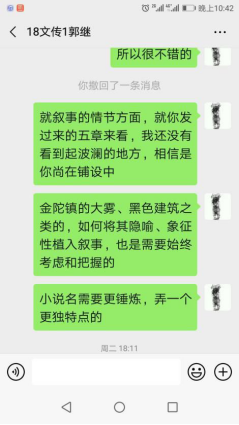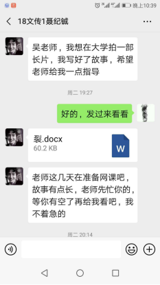 在假期中,支部的教师党员还收到了18数媒专业聂纪铖同学的剧本《裂》和一段令人鼓舞的留言:“老师,我想在大学期间拍一部长片,我写好了故事,希望老师给我一些指导。”而作为大二学生的他,已经在过去的一学期中完成了一部质量不低的微电影《火》,在同学们之间形成了一定的影响。也是这个假期,他们收到了18文学苏赞赞同学令人欣喜的表白:“总而言之,选择文学是我认为最正确的事情!”而在2019年上学期,苏赞赞同学曾经在因为选择专业上的万分纠结,曾经向支部才党员教师们寻求帮助。