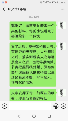 的“名人”学生,才气出众,写作、演讲、辩论、主持等样样出色,还有较为成熟、深入的研究能力,常常被任课教师们感叹是“十年一遇”的优秀学生。这个“寒假”出乎意料地超长,针对郭继同学的个人特色与能力,吴智斌老师与郭继同学家长联手给其开出了两个特色任务:一是根据其兴趣研读家乡宿迁知名作家鹿桥文集并选题完成专业论文一篇;二是推进其准备多时的长篇小说《洪流》的写作。到2月14日,郭继同学整理完成了小说13万余字的文稿,前五章计3万已经修改定稿,并与吴智斌老师、姚晓萍老师进行了较为细致、深入的讨论与修改。