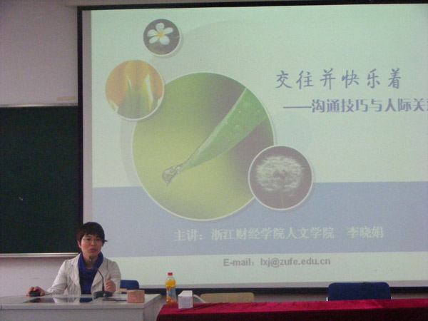 整个讲座, 李晓娟老师从“听”、“说”、“看”三方面着重讲解了在人际交往过程中所应注意的沟通技巧,并阐述了无我、倾听、同理心、支持的回应等具体解决方法。李老师幽默诙谐的语言风格,富有深意的演讲内容不时赢得了同学们的阵阵掌声。在场聆听的不少同学都觉得此次讲座让他们受益匪浅,坦言:“在日常的生活中,我们总会遇到或大或小的心理障碍。这次讲座让我们找到了很多解决的途径。”