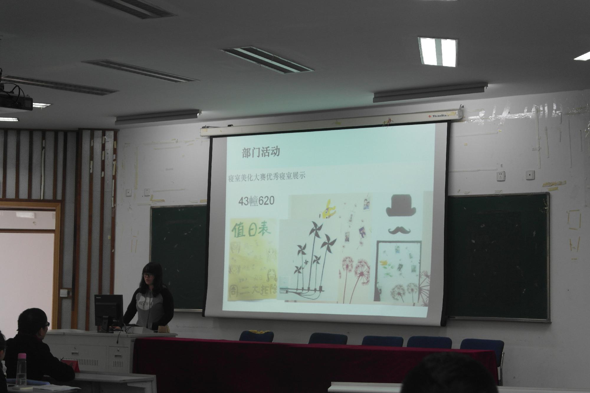 随后生活权益部对其部门相关工作做了详细汇报。展示了十月份寝室美化大赛中的优秀寝室,还公布了九月份和十月份获得流动红旗的名单以及对违规寝室的通报批评。
