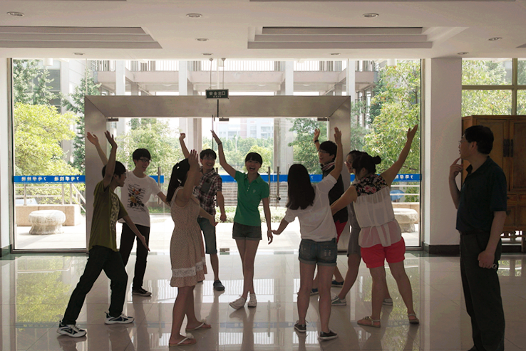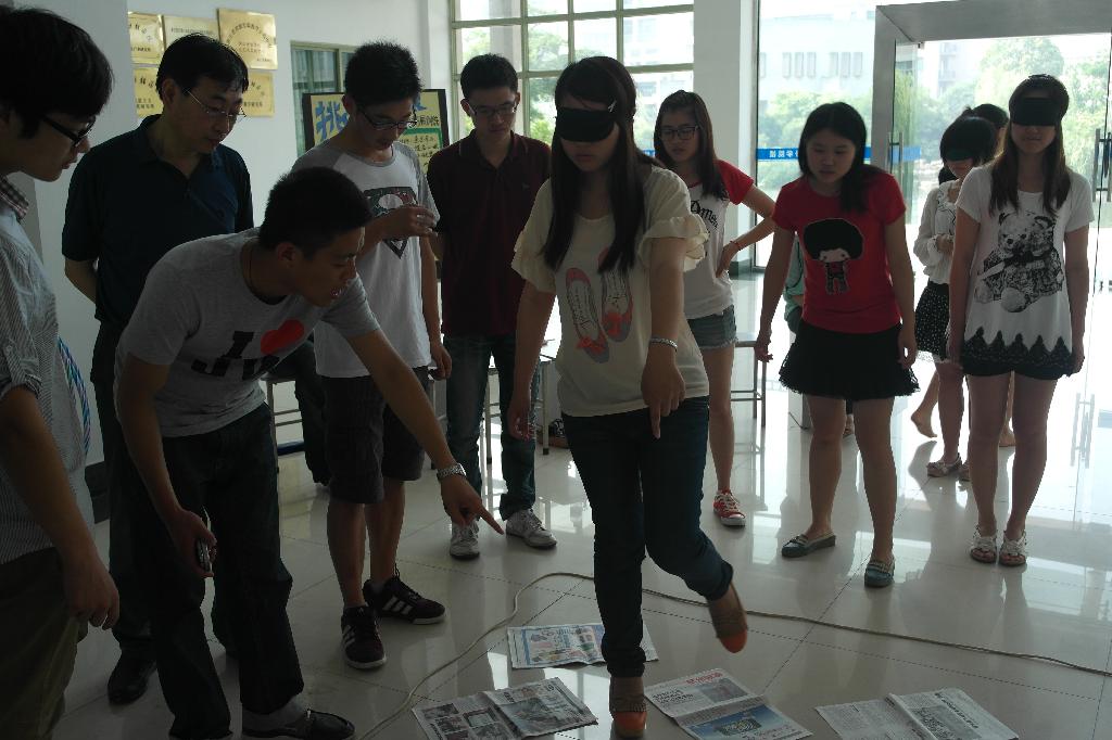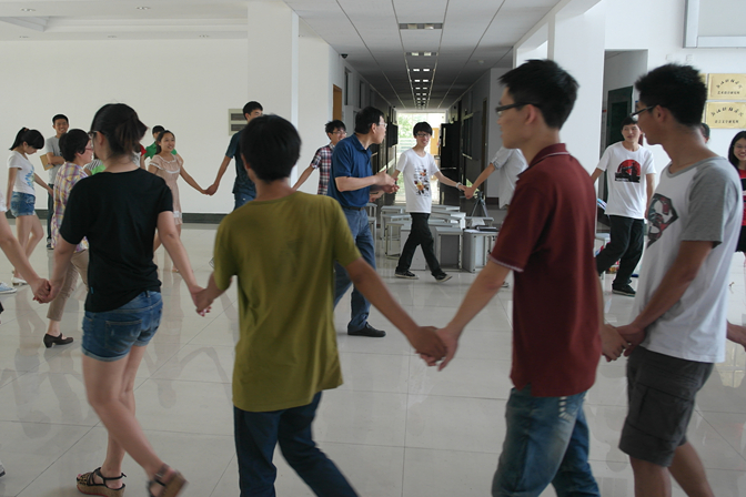 活动从流沙河谷游戏展开,同学们通过虚拟全体渡河,开始融入集体,团结协作。同心圆游戏是本次活动的一个精彩之处。在同心圆的比赛中,每个小组的所有成员围成一个圈,每位同学只用一个只指共同托住一个呼啦圈,然后一齐发力将呼啦圈从腰部托举到眼部,保持平衡停留在稳定状态一段时间。在呼啦圈的上升过程中,不能有任何一个同学的手指脱离呼啦圈,否则就算挑战失败,完成时间最短的小组为优胜方。很多同学在开始玩的时候由于成员身高参差不齐、配合不够默契、过于心急,而经常出现呼啦圈倾斜然后掉落以致失败的状况。第四组却有同学创造性地想到根据三角形的稳定性,将全组成员分成三三一团,并拢手指,九位同学的手指力量集中在呼啦圈三个点上来托举呼啦圈,并获得了成功,收获了胜利的喜悦。之后的勇闯地雷阵、链接加速中,配合越来越默契的各个团队在闯关中越来越顺利,都很好地完成了比赛。
