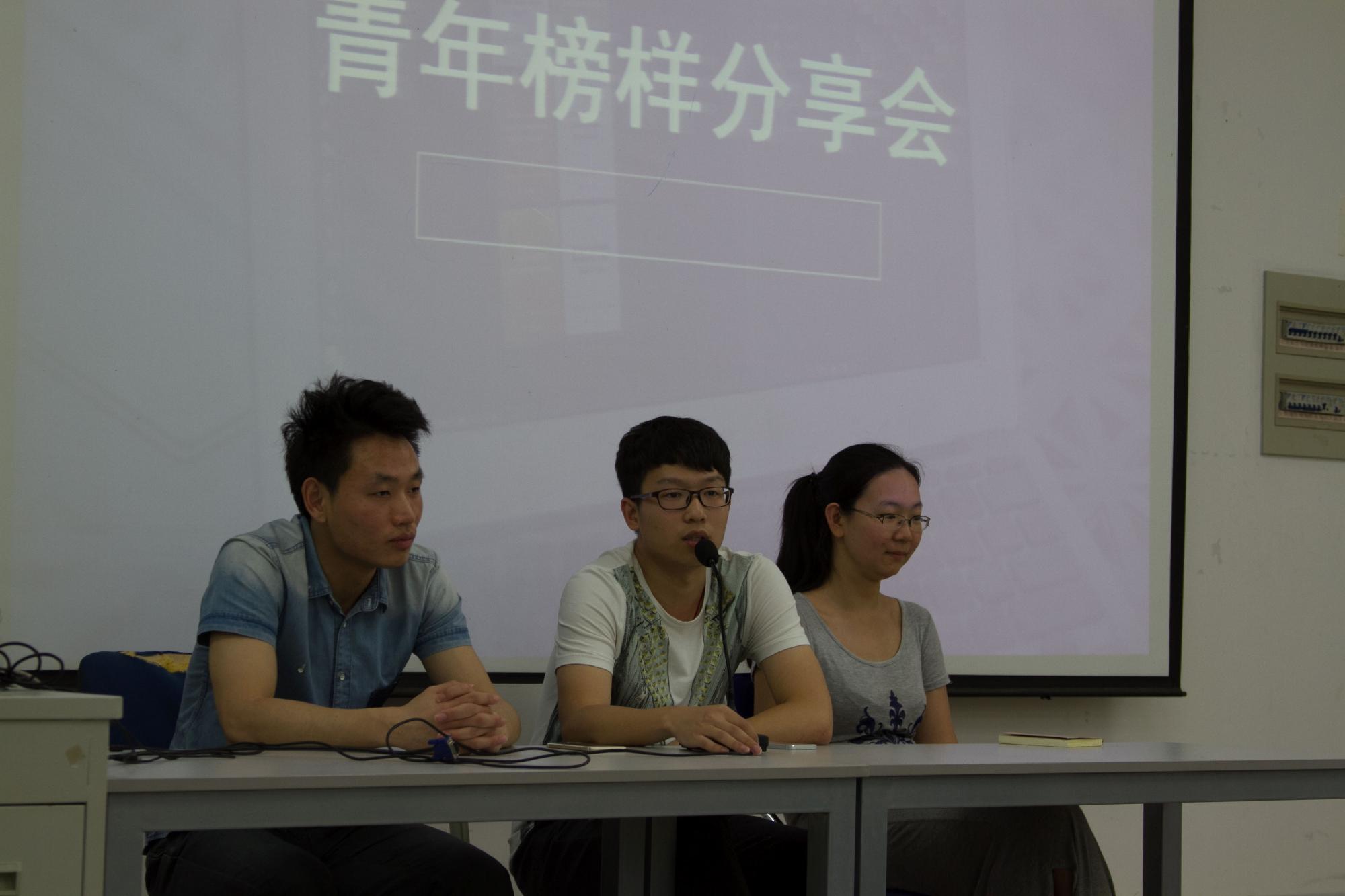 榜样,以他们自身的经验为立足点,与学弟学妹们交流分享所谓大学的各方各面。首先,裘申涛学长开讲。他所分享的内容丰富,主要包括如何处理工作与学习、校内与校外、各种人际关系与情感问题、就业问题。他强调进入大学要认清自我,科学规划大学生活,确立一个目标作为自身坚持的动力。学长在大二暑假有了社会实践,在实践中他体会到了与工作人员接触和与学生接触的差别,他鼓励学弟学妹们要积极“走出去”积累社会经验。在提高自身素质的同时,要培养一技之长,培养自己多方面的兴趣,给就业多一份选择。当然,在大学里也要考各种最基本的证书。