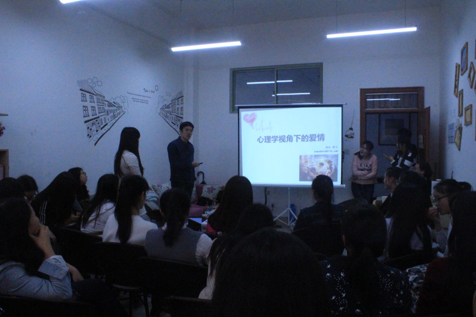 4月28日下午14时,在成人韩漫 楼402举行了一场题为“心理学视角下的爱情”为主题的心理沙龙活动,主讲老师为中国人民大学心理学博士周浩老师。心理辅导员袁慧兰老师和40多位同学参加了此次活动。