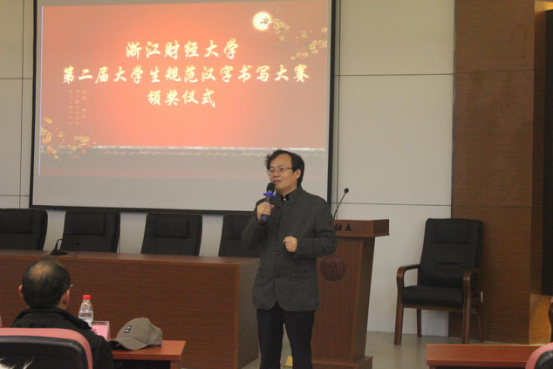 规范汉字书写大赛所取得的成绩,并向给予本次活动大力支持的学涯书法社以及为办好本次书写大赛付出辛勤劳动的同学、老师们表示衷心的感谢,向获奖的同学们表示热烈的祝贺,最后对在座的同学提出了希望。他指出,书法艺术能培养人的浩然正气,也是一个人的第二形象,是中华优秀传统文化的一个重要组成部分,希望同学们从中学习到书法艺术的精髓。同时他也希望大赛能够一年一年地举办下去,让它成为一个文化教育的品牌。