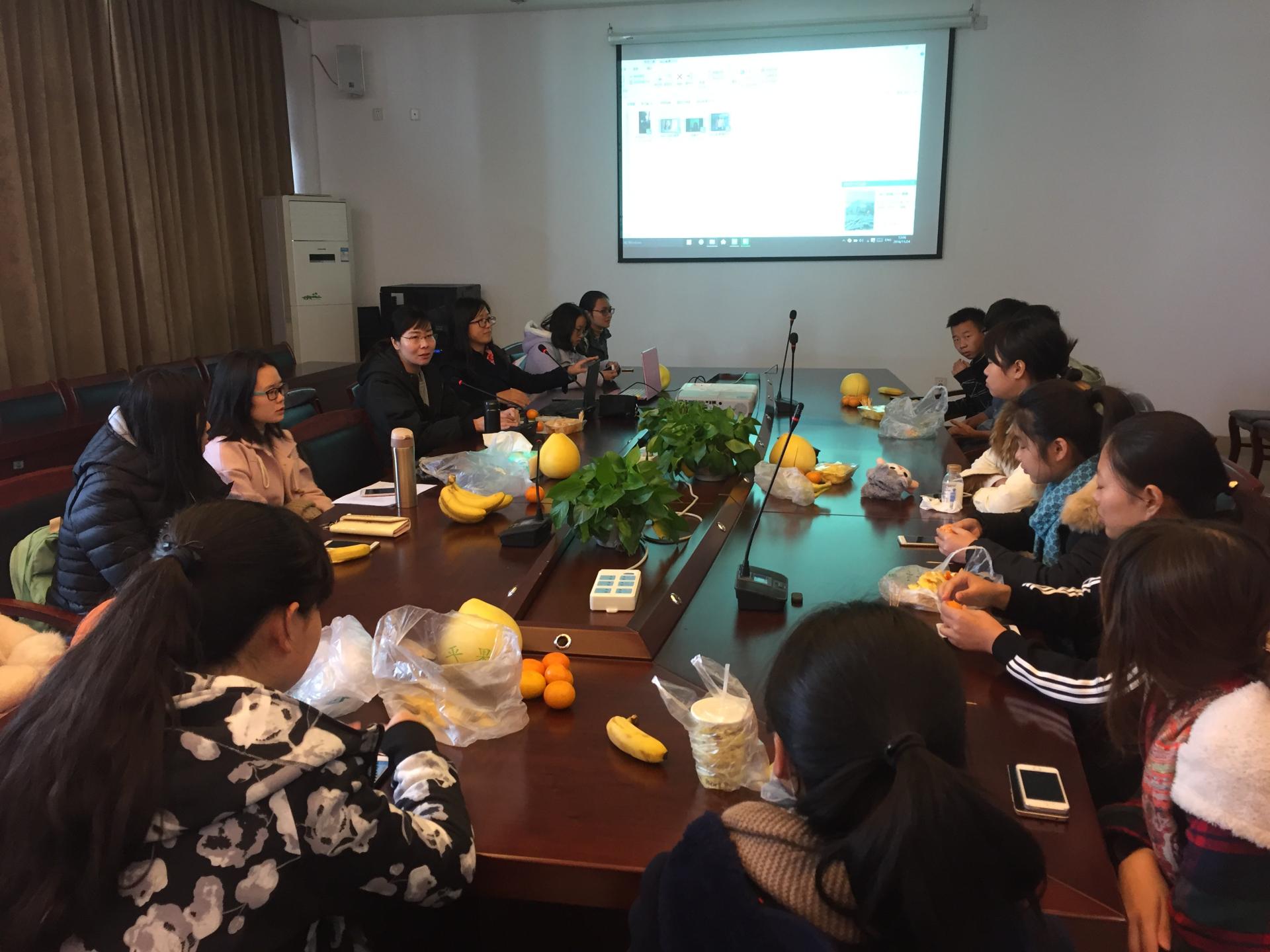 第一阶段在一问一答、说说笑笑中很快过去了,短暂的休息之后,沙龙进入到了第二阶段。付老师播放了提前让学姐们准备好的视频,同学们边吃着水果,边观看视频。视频里,学姐们以自身经历为例,告诫我们四年韶华易逝,且行且珍惜。在她们曾经的四年里,她们也有过同样的困惑,也遇到过同样的问题,但她们没有放弃,勇往直前;她们也曾迷茫,也会感到不安,但人生路漫漫,不能规划好所有后再上路。她们说,往后会遇到很多人,会经历很多事,但现在请你好好充实自己,往后的你,会感谢今天努力的你。