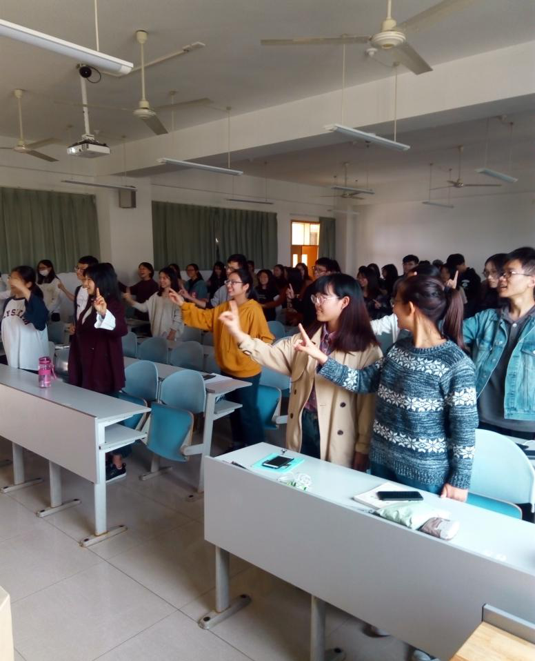 园上百人的越剧大合唱,实属少见。“娴静犹如花照水”,“娴”发yan的音,“如”发为ri,“水”发为sui。当说到,“越剧里面的念白是没有翘舌音的哦!”多数来自江浙,普通话考级深受翘舌音苦虐的同学,发出会心一笑。大家像小孩子刚学说话,一字一字的学发音,时而互看一眼,忍俊不禁。学到“只道他腹内草莽人轻浮”这一句,“黛玉”还教大家怎样手捏兰花指,右手从上而下画一个圈,指向“宝玉”。有同学还举手提问,“黛玉”唱的时候,不唱的“宝玉”该做些什么动作呢。