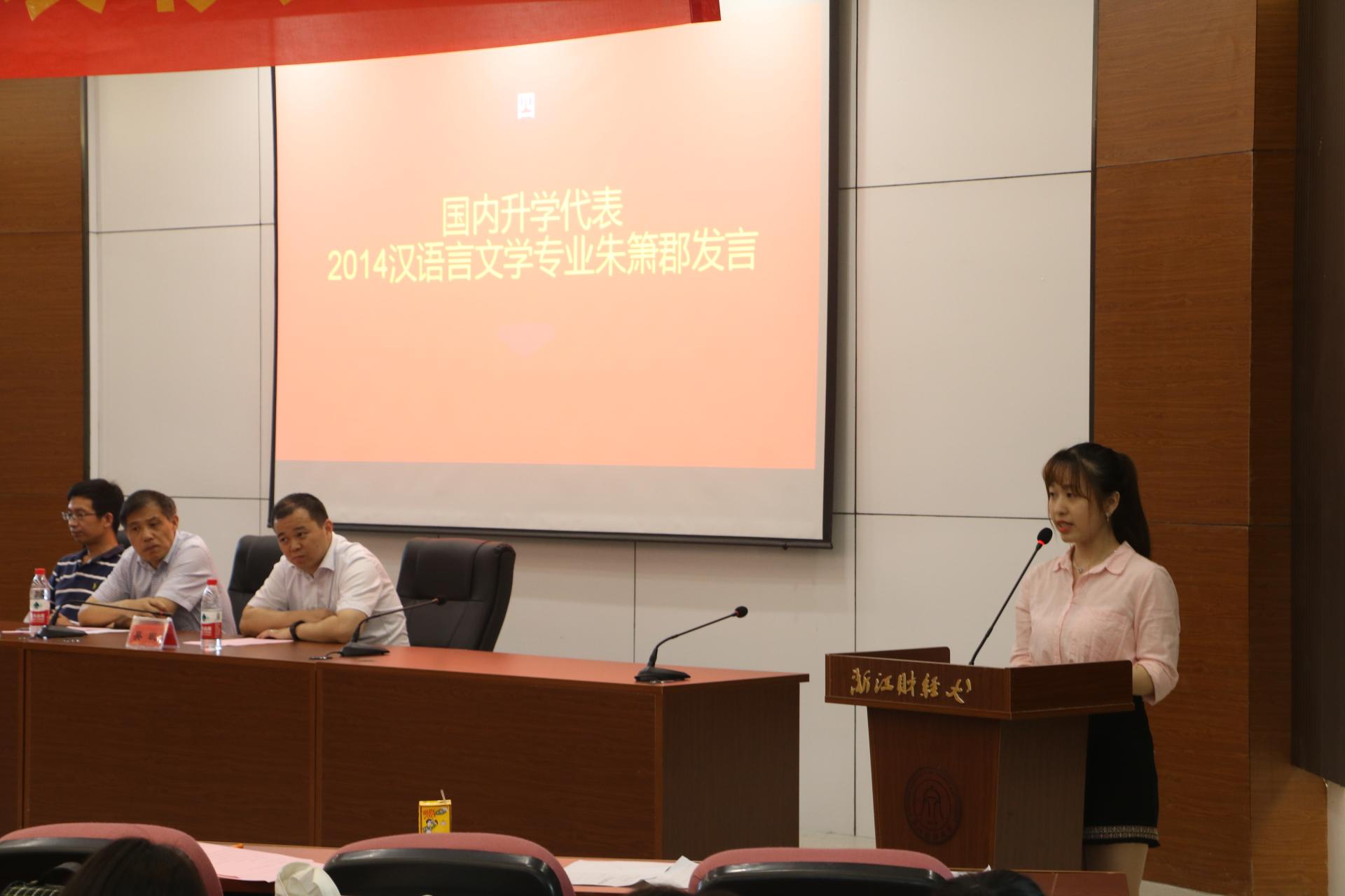 孙德平老师也对2018届考研(出国)学生表示祝贺,他希望同学们通过读书深造,给自己创造更多选择,追求并实现自己的梦想。2018届汉语言文学朱箫郡同学、2018届数字媒体艺术专业的张哲同学分别作为学生代表发言,分享了自己的心路历程和备考经验,为学弟学妹们提供了中肯实用的建议,并耐心解答了学弟学妹们提出的问题。