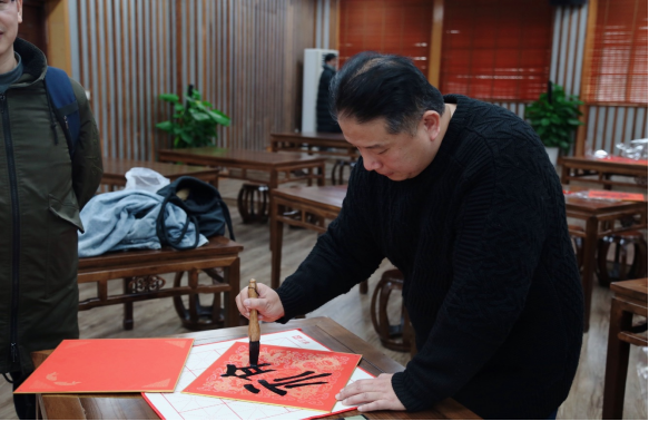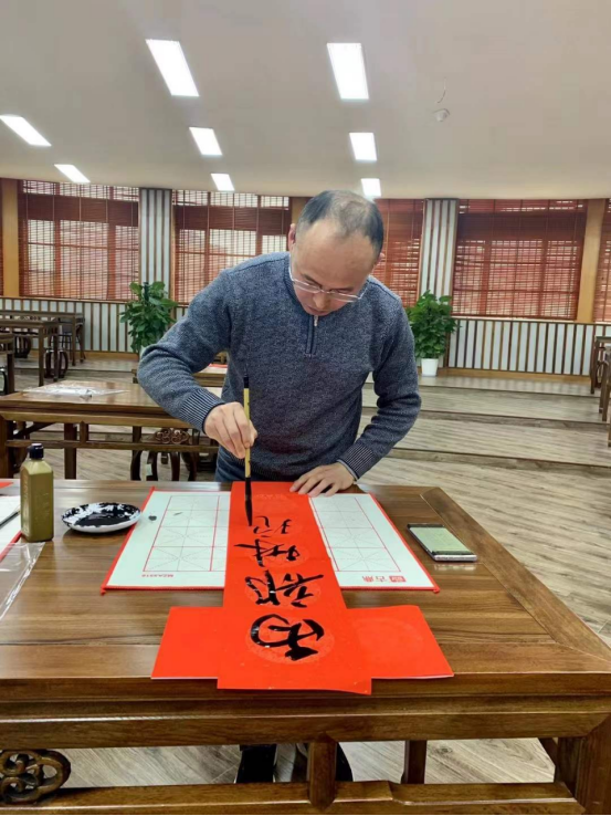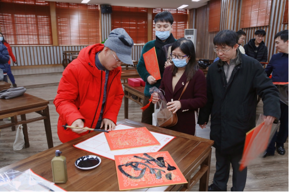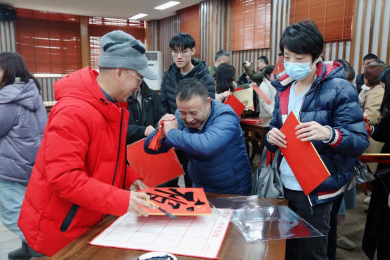 教师周寒筠和赵文源老师为教职工现场写“福”字和春联。现场墨香四溢、喜气洋洋,红红的福字和灿烂的笑脸将活动现场烘托得格外的火热和喜庆,老师们高兴地展示他们刚刚拿到的“福”字和春联,喜悦之情溢于言表。
