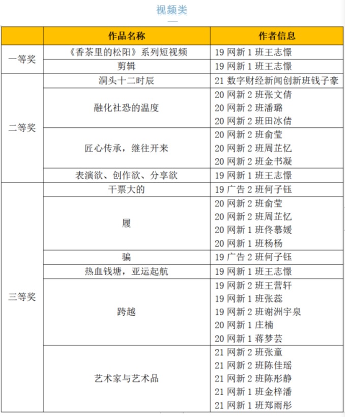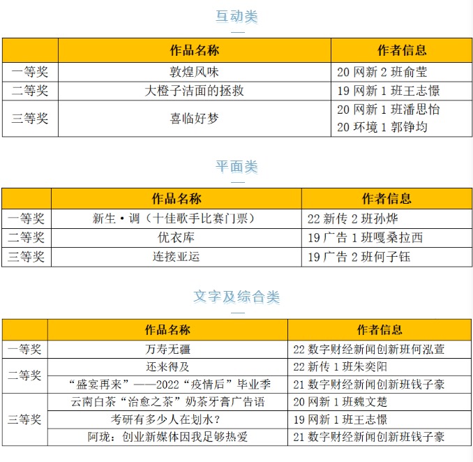 本次展会涌现了不少“创作大户”,他们提交的作品数量多、质量高,例如19网新1班王志憬,他获得了一等奖2项、二等奖2项、三等奖2项,涵盖了视频类、互动类和文字及综合类;19广告2班何子钰同学获得平面类三等奖1项,视频类三等奖2项;21数字财经新闻创新钱子豪同学获得了视频类二等奖1项、文字及综合类二等奖1项、三等奖1项。这些同学在展会中大放光彩,体现了他们勤于实践、多方面发展自身专业能力的努力成果!