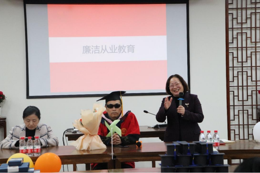 对毕业学子的深切关心。随后袁老师为毕业生开展了廉洁从业教育,以期毕业学子在未来工作与生活中循梦而行、向阳而生。伴着最后的师生交流活动,毕业座谈会慢慢接近尾声,毕业生与昔日深切教诲的老师回忆美好,畅谈未来。