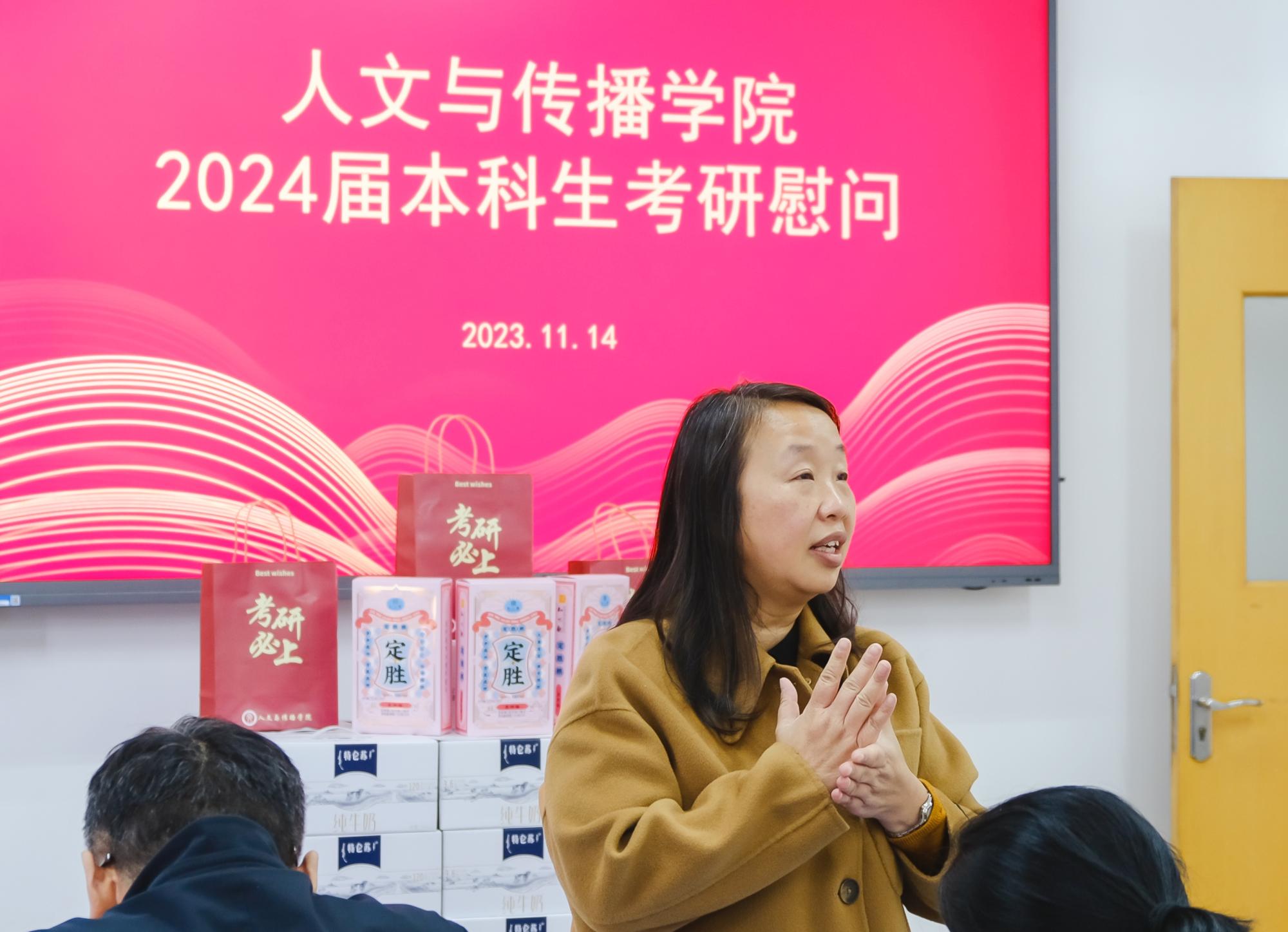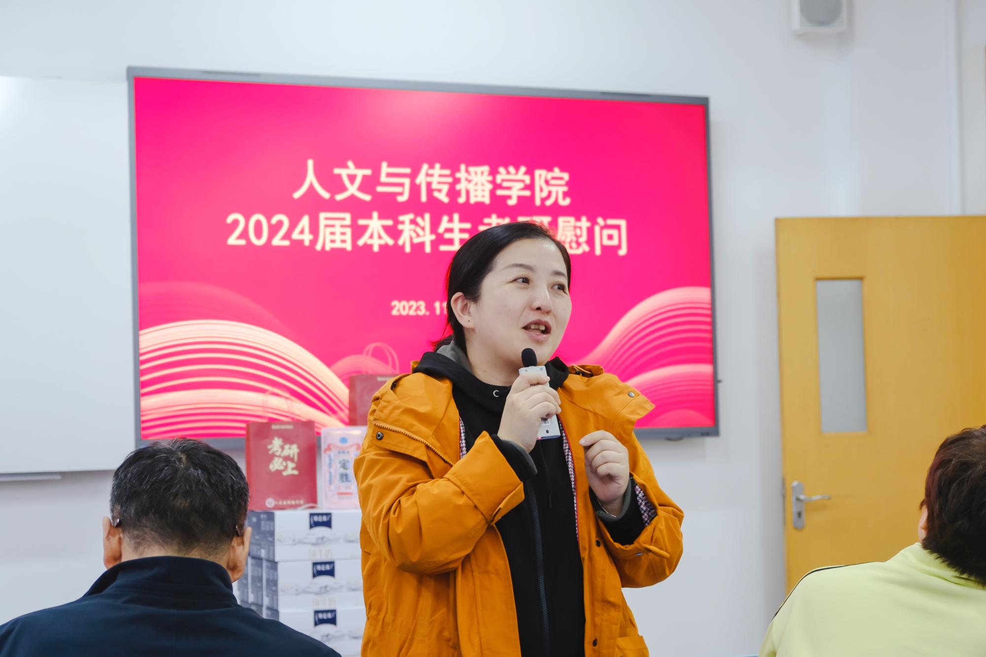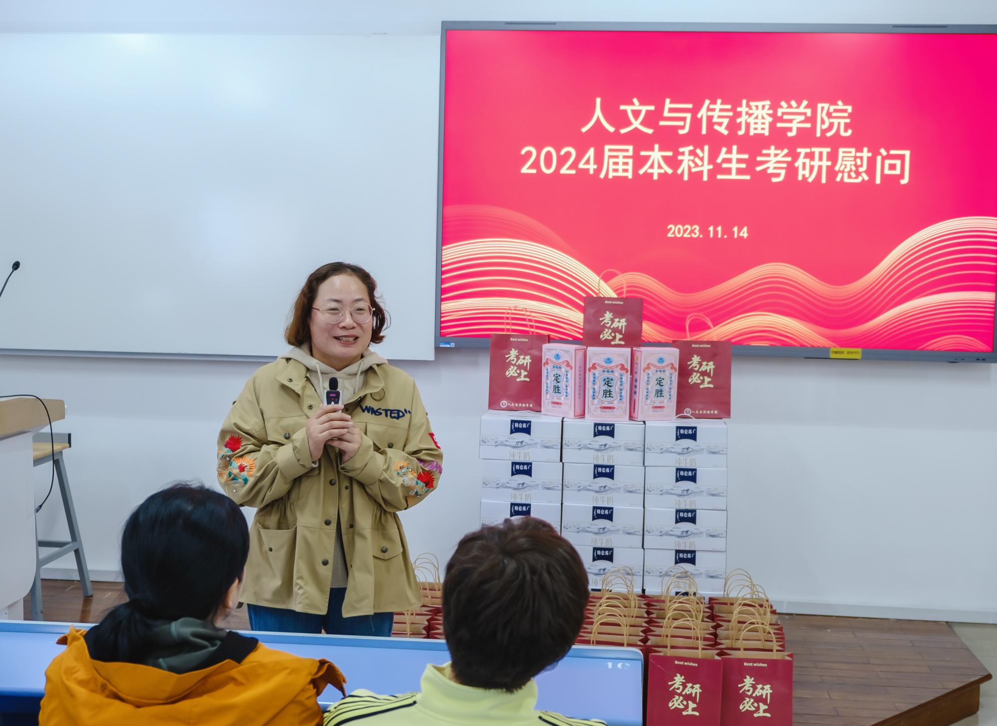 于B楼201教室举办了2024届本科生考研慰问活动,院长周保欣、院党委书记高燕、院长助理吴智斌、网络与新媒体系主任王文奇、成人韩漫