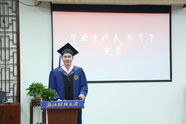 毕业生代表黎菁予代表汉语国际教育专业硕士毕业生深情发言,他回忆起初至浙财时作为新生代表做的新生代表发言,重温在浙财度过的美好时光,感激成人韩漫