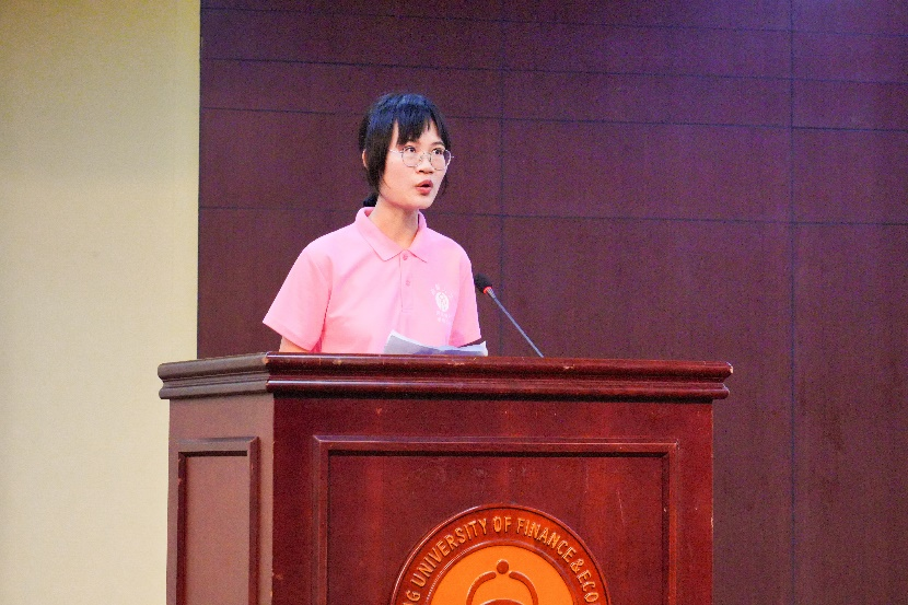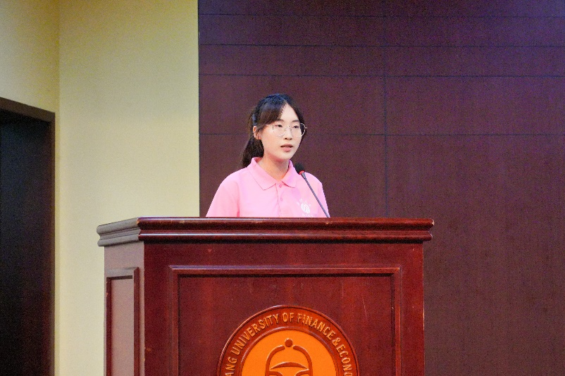 箴言启航,青春绽放。新生本科生代表周歆宜分享了自己初来乍到的不安。然而此刻发言的她,显然已经拥有了面对未知挑战的勇气。在短暂的磨砺后,同学们都应该更加自信地迈向大学生活。“新生们应以文化传承为使命,用文字、镜头和声音记录时代,用独立思考和创新精神探索知识海洋。”如其所言,周同学鼓励同学们积极参与活动,培养人格魅力,面对挑战保持勇气和坚持,让所有在浙财的时光都充满诗意,让每一刻都弥足珍贵。字字句句肺腑之言,周同学的发言不仅展现了新生的朝气与决心,更激发了在场师生的共鸣与期待。