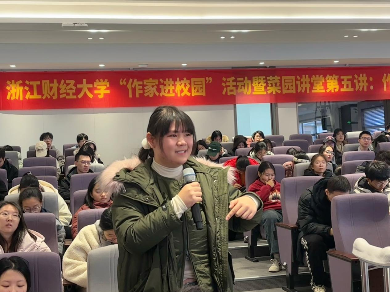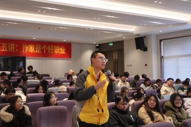 互动环节,同学们踊跃提问。龙一就文学内容创作与现实背景条件的关系,以及小说技巧等进行详细解答。他表示在创作中技巧仅仅是一方面,重要的是内容层面知识的积累,丰富的知识能够作为小说内容搭建的框架,并以此为基进行更加有深度的文学创作。