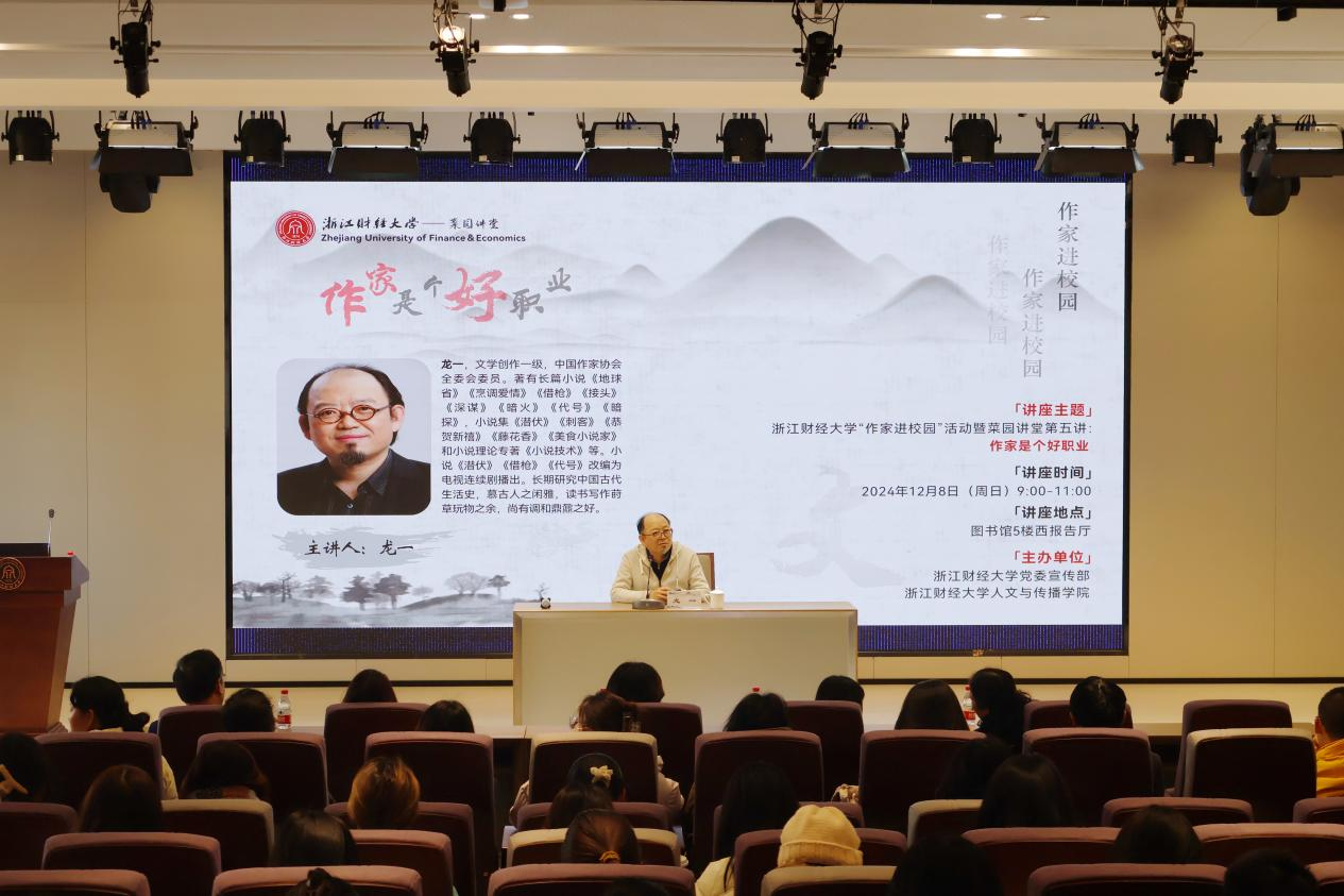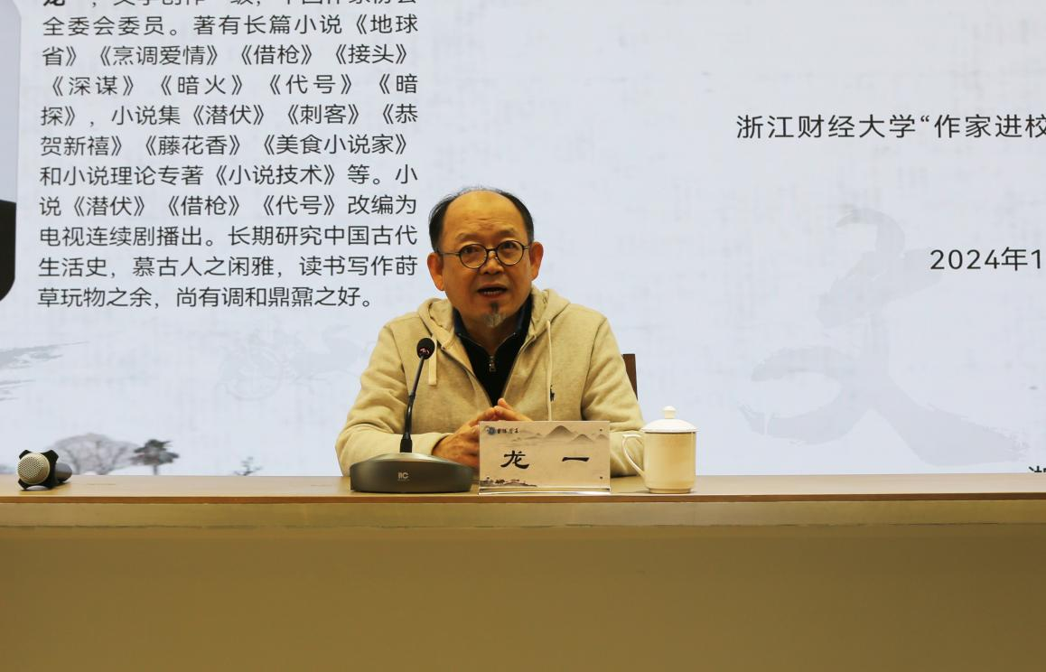 “文学来源于生活,多读书多认字,学会讲故事是首要”。龙一鼓励写作初学者要学会将写作与生活适当拉开距离——打造一个读者相对陌生的环境,借用部分的实例来进行辅助,把握人物言行的流畅、文章情节逻辑的自洽,更加自由地创建新奇的世界观,在自己构造的世界中去说服读者。他鼓励同学们热爱生活,善于观察,关注细节,依托真实细节的故事才更具说服力。他以自己的第一部中篇小说《刺客》为例讲述了生活细节的重要性、学会运用生活积累。龙一表示,“写作品要与众不同,要扬长避短,避免吼叫式冲突。无论是长篇小说还是短篇小说,要有大量的基础训练,让自己始终保持写作的新鲜度”。他认为写作就是一场马拉松,是一个漫长的过程,在这过程中要学会积累。