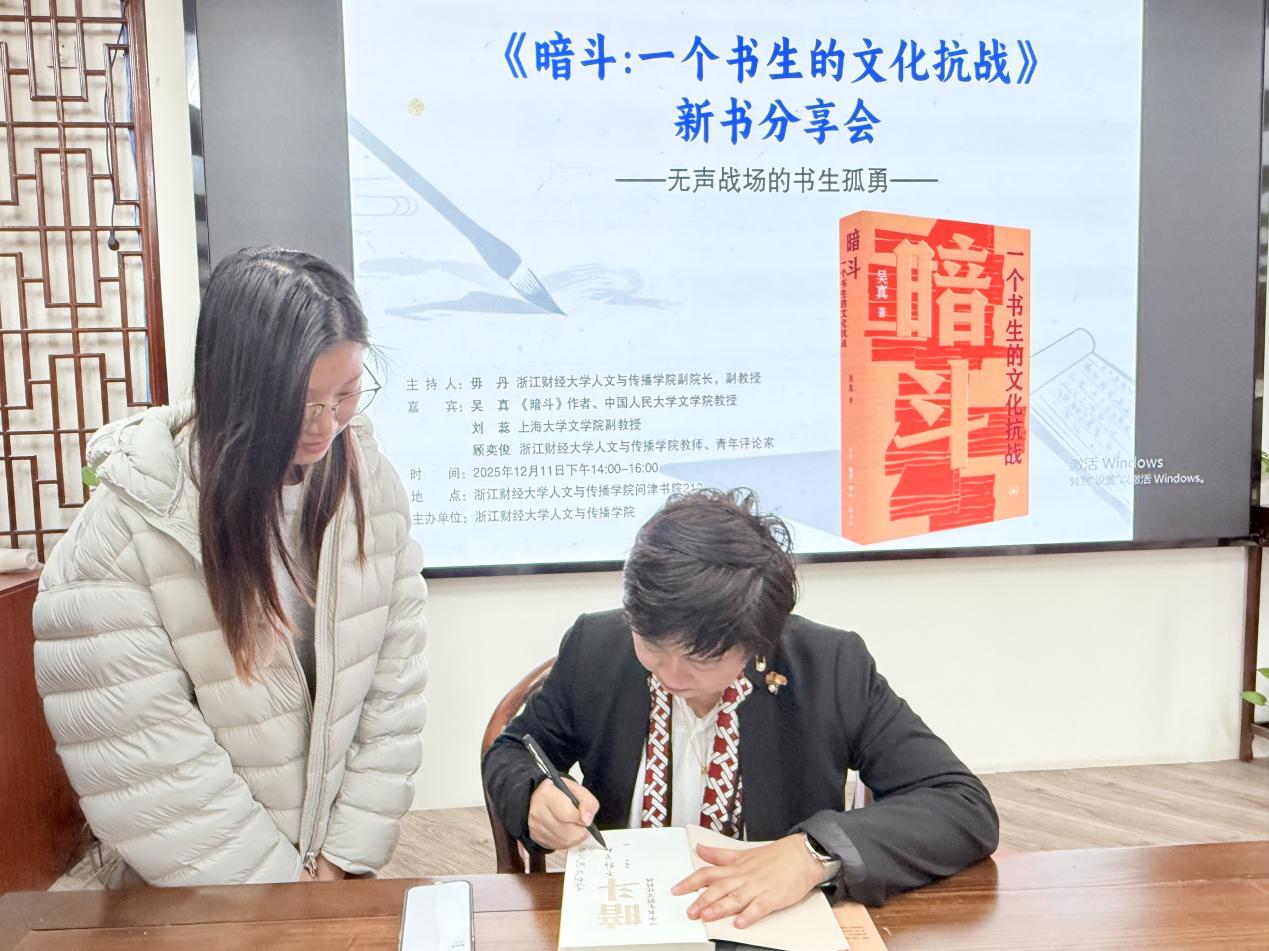 活动尾声,吴真教授为现场读者的藏书签名留念,并勉励大家通过阅读,更深入地思考抗战、文化与个体生命之间复杂而永恒的关系。笔墨为刃,文心作盾。本次分享会不仅引领师生们重回那个没有硝烟却同样惊心动魄的文化战场,更照亮了埋藏于故纸堆中的风骨与精神。读书人的坚守,在乱世中是守护文明的火种,在今日,依然是激励后辈砥砺前行的力量。