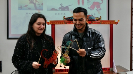 皮影戏作为我国的非物质文化遗产,是一种古老的中国民间传统艺术,集工艺美术、文学作品、音乐创作、舞台表演等各种元素于一体。通过现场展示,留学生们了解并体验了《哪吒闹海》《年的故事》和《武松打虎》三部经典皮影剧目,将丰富多彩、制作精美的皮影人物舞动起来,在皮影的翻飞腾挪中,在传统优美的唱腔中,每位学生都融入到绚烂的皮影艺术中,现场气氛热烈。