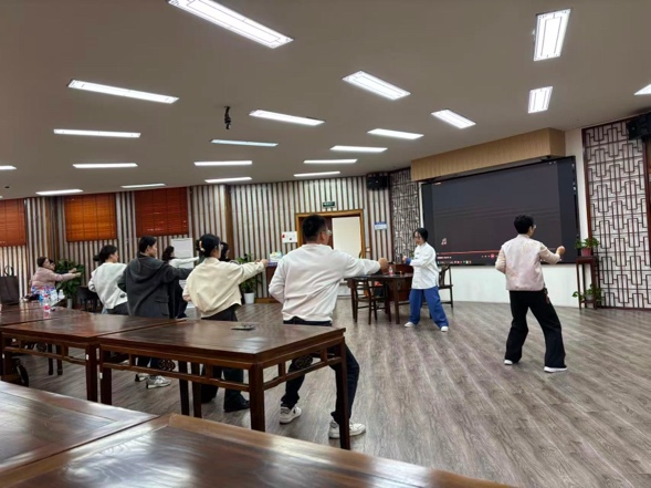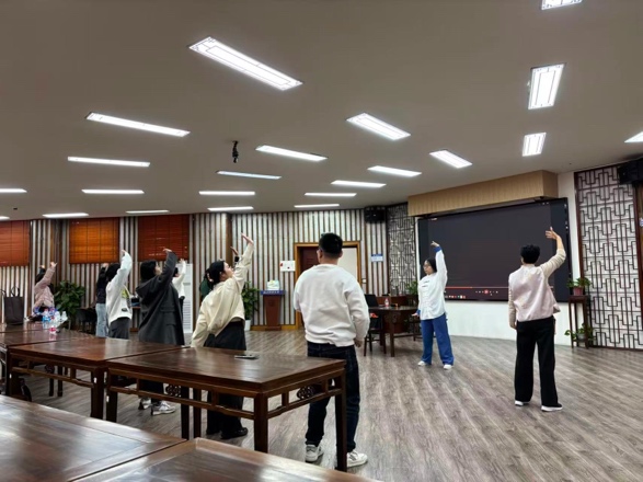 活动伊始,教练详细介绍了八段锦的历史渊源与健身原理,强调其“柔和缓慢、圆活连贯”的动作要领。随后,教练带领教职工们从基本站姿、呼吸方法入手,逐步分解每一式动作,耐心纠正细节,确保练习规范到位。现场氛围轻松愉快,教职工们认真揣摩动作,互相交流心得,在舒展筋骨的过程中有效缓解了工作压力。