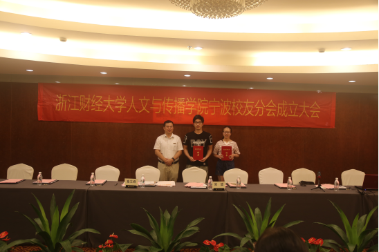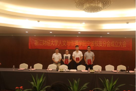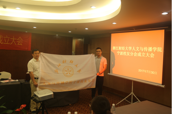 宁波校友分会章程》和首届理事会名单。吴玻老师为宁波校友分会会长、副会长、秘书长和副秘书长颁发聘书,并为宁波校友分会进行授旗。宁波校友分会会长林炳芳代表参会校友发言,他感谢了母校搭建校友平台,回忆了在母校的美好时光,对校友分会成立以后的工作进行了展望。