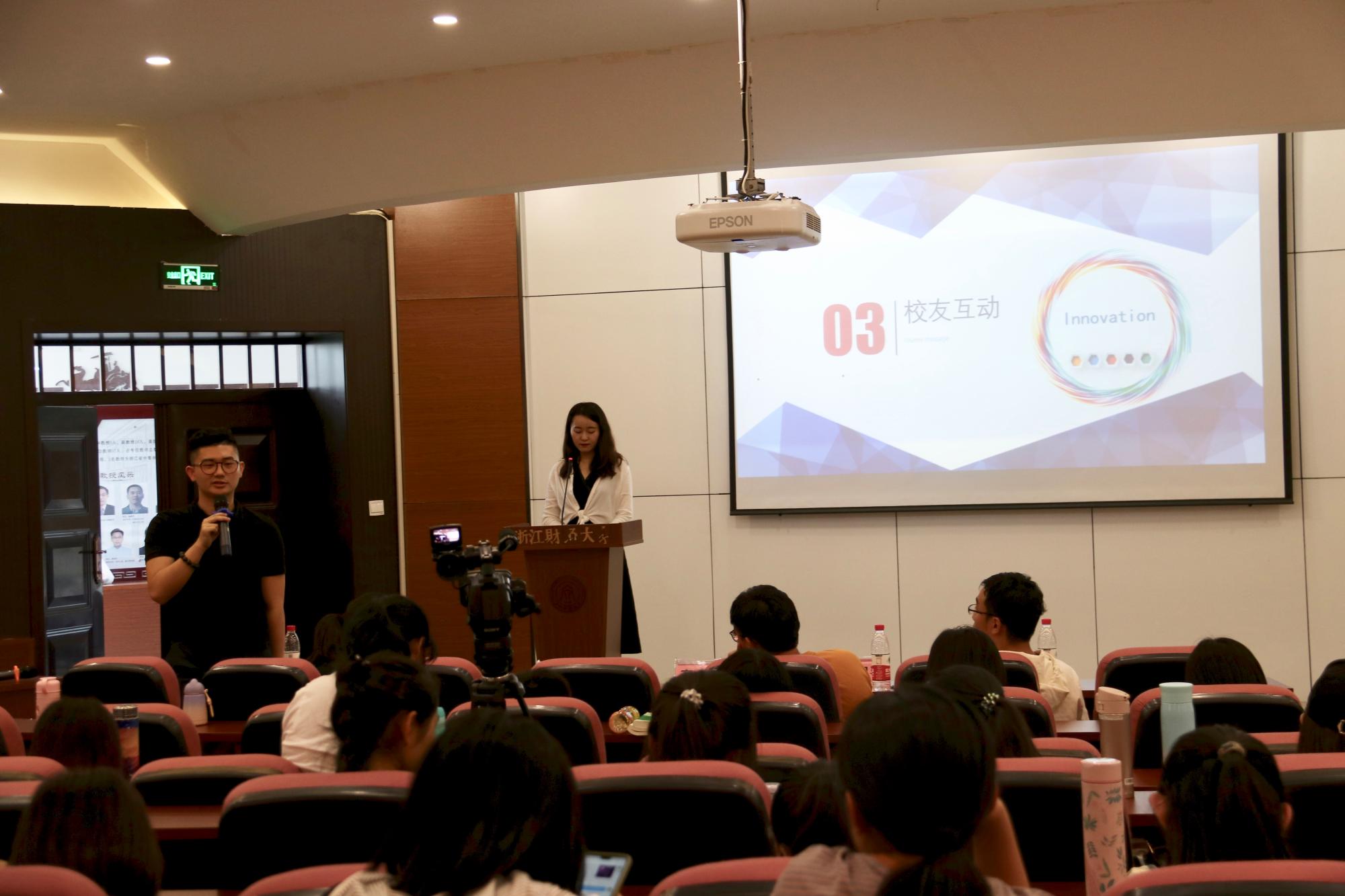第二阶段,校友们纷纷与在校生分享了自己创业经历和创业故事。赵国强校友通过过讲述“做好两件事”“产品商业化”“合理分工”“定义成功”等七个主题向大家分享了他的创业感悟;张加林校友结合自身的创业经历和大学生活,声情并茂地对大家进行了创业经历;汤凯文校友从他的创业经历出发,分享了成人韩漫和企业定位,同时还强调了“合作”和“反思”在创业过程中的重要性;詹天卓校友风趣幽默地讲述了自己的从业和创业过程,向同学们强调了“做人”和“情商”在商场中的重要意义。在互动环节,同学们就大学阶段的专业学习对创业的影响,创业途径以及创业的生活节奏与校友们进行互动交流,四位校友结合自身经历,一一回答了同学们的提问。