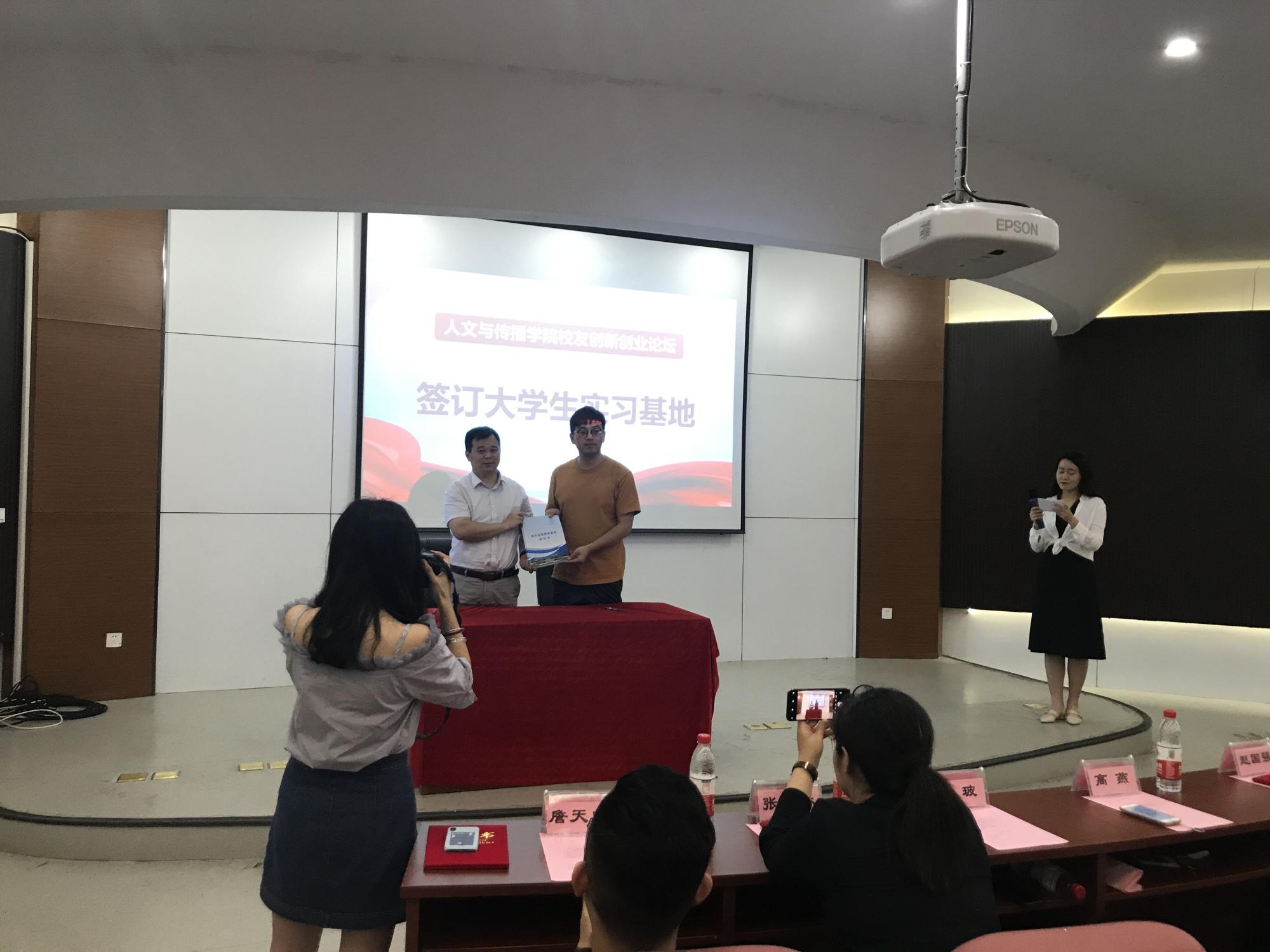 创新创业教育和人才培养作出更多贡献。随后,高燕书记为校友们颁发了创业导师聘书和45周年校庆邀请函,吴玻副书记与浙江智匠影视文化有限公司创始人赵国强签订了大学生实习基地。