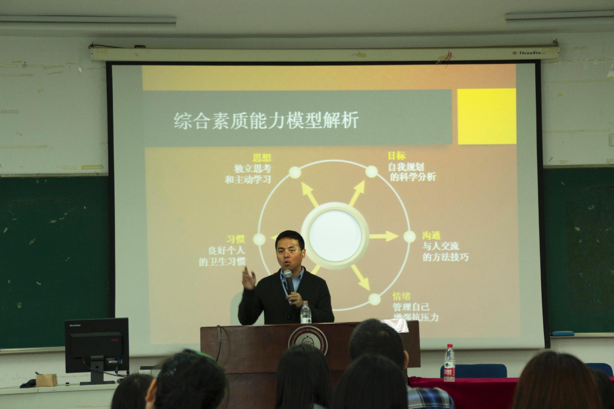 特邀请了中青育成集团副总经理、四川省就业指导委员会指导老师王铭先生进行讲座。讲座主题为:“大学生核心竞争力的培养”。来自人文成人韩漫