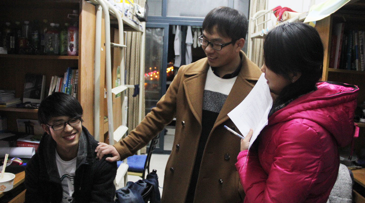 2014年12月13日,成长伙伴们进行了本学期最后一次活动。他们兵分两路,一路到位于桃李苑23幢的女生宿舍进行了走访;另一路则在辅导员章立峰老师的带领下来到位于成蹊苑31幢的男生宿舍进行走访。学长学姐们在宿舍里同14级学生一起谈论校园生活,分享生活的经验,抚慰想家的心灵。同学们询问了许多关于期末考、选课的相关事宜,成长伙伴都一一作答、细细道来。有些学长学姐还关切地问到同学们是否已买票,并嘱咐大家要及时取票,令同学们感到十分地温暖。最后,为了使成长伙伴系列活动得到改进与提高,成长伙伴临走前让同学们多提提意见与建议,交张小纸条。纸条的内容包含了许多建议,同时更充满了对成长伙伴的感谢。