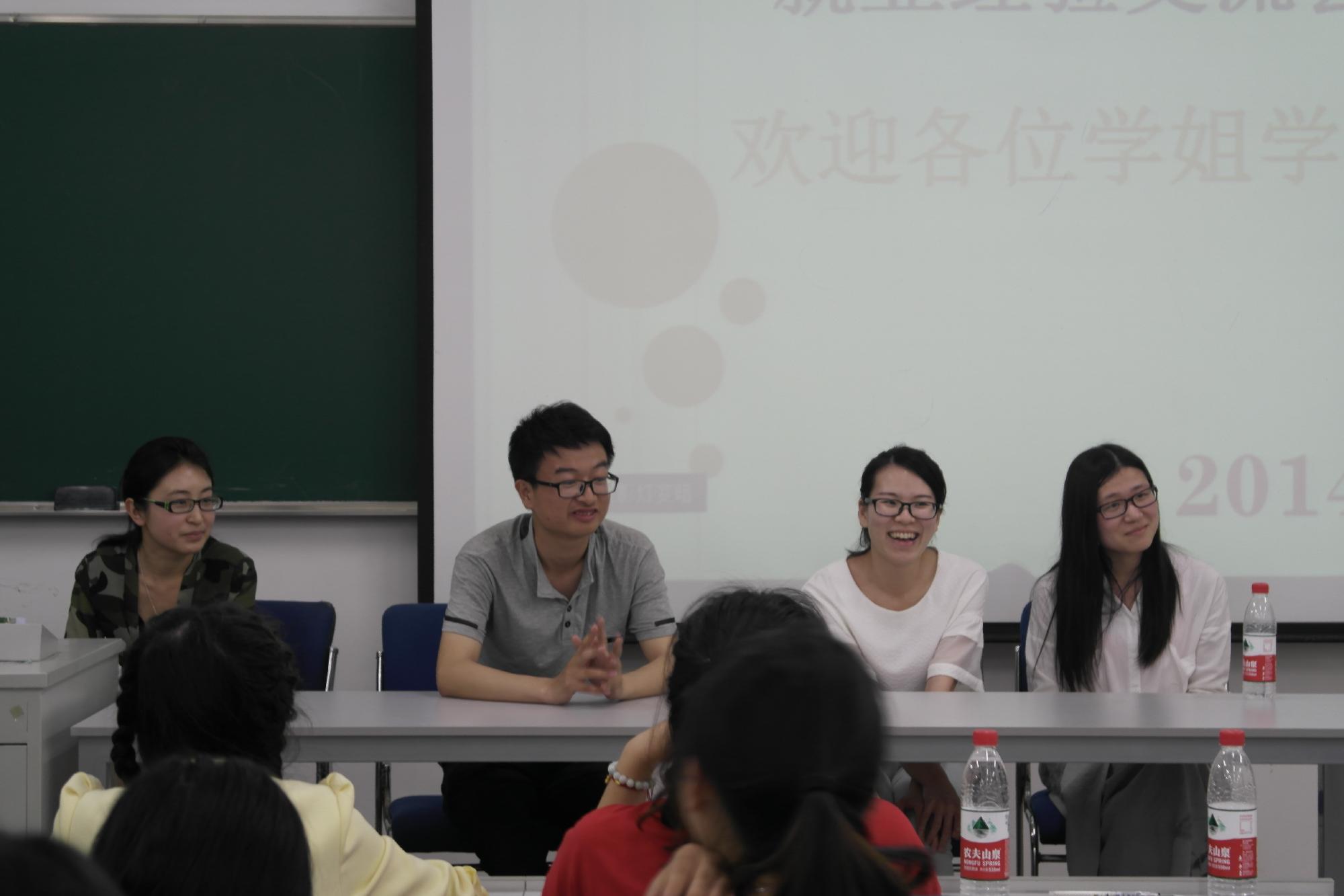 2014届的洪婵、瞿文逸、于然、孙广宇等四位优秀的学长学姐,他们以他们自身的经验为立足点,向大一大二的学弟学妹们传授心得。首先,曾为12文学班班助的洪婵学姐开讲。洪婵学姐谈及了当今的热门“国考”,即公务员考试中的一些小经验。学姐说道,在公务员考试前,必须要了解自己所要报考的岗位,要了解到所在地在哪、这个岗位是否有上升空间等,以自己的专业出发。其中,笔试的行测,由于题目数量较多,所以得学会放弃,选择自己最擅长的题目,保住分数。那么这就需要多练习,从真题当中找思路,归纳总结出来。而申论,则更是需要一种感觉,需要一种准确的思维,用“接地气”的方法去写。而公务员考试中,至关重要的一点就是面试了,当被面试的时候,需要一种良好的心态,正确去对待,这就需要多多面向公众场合找到自己的预感。洪婵学姐最后提出了她自己在公务员道路上的“走出来”的经验,除了以上几点,还有要认清自己的实力,要全方面性的掌握知识,了解最新的就业信息。