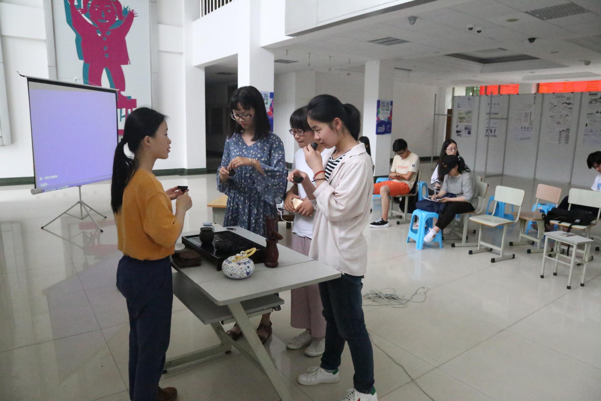董春晓老师通过提问的方式切入活动,讲解了有关茶文化的一些简单常识,并与同学频繁互动,在互动中加深同学们对茶文化的了解。活动尾声,由陈欢同学为同学们表演茶艺,为本次活动圆满地画上了句号。