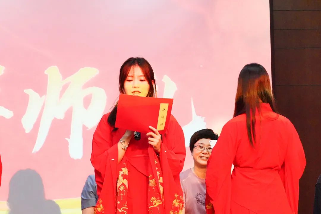 凡学之道,严师为难。师严然后道尊,道尊然后民知敬学。黄咏梅教授、荆亚平教授、付伊副教授、熊啸副教授、王怀榕老师、董建华副教授、王文奇老师、郝文琦老师八位老师作为教师代表上台入席。新生代表向师者行礼并呈上拜师帖,老师们也以小礼相回,新生们恭以大礼相报,而后三拜行拜师礼,老师代表朗诵示训,至此礼成。谆谆教诲中饱含着对各位新生皆能以礼待人、以德修身、时刻自励、勿忘初心的无限期许。