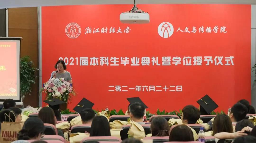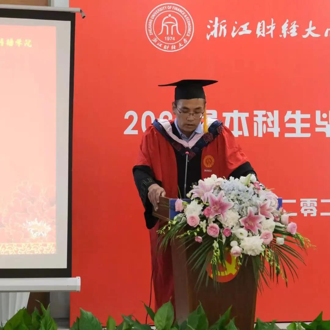 毕业典礼由周保欣院长深刻真诚的致辞开场。“我们生活在一个动荡的世界,走在一条未知的路上。不管这个世界如何变化,我们都要以不变应万变,坚定自我的方向和目标,用人类文明和价值理性塑造我们的生活。”在未来的人生道路上,周院长勉励各位同学建立自我的价值生活,直面生活的苦难,通过文学丈量生命的时间,矢志追求更有高度、更有品味的人生。临近毕业之际,周保欣院长欣慰地感慨:“江山代有才人出,相信你们会具有比我们更优秀的潜质和禀赋,你们会比我们做的更好。”希望同学们在浙财的求学经历成为前途坚实的路基,在成人韩漫