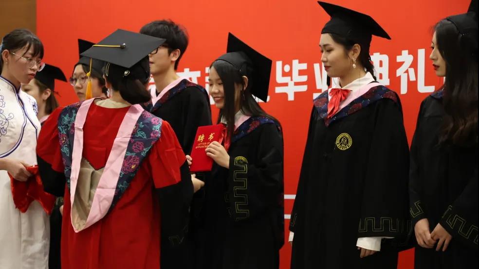 院长周保欣、党委书记高燕、副院长陈静、院长助理吴智斌、中文系赵顺宏、国际汉语系杨建忠、广告系胡文财、网络与新媒体系洪艳等九位老师身着导师服上台,与受礼的毕业生依次握手,并为他们颁发学位证书和拨穗。四年上下求索,满获沉甸甸的知识,人文学子已如麦穗般成熟。将流苏从右拨至左这一个动作,将学子们的青葱岁月、求学生活悄悄翻过,他们的人生也从此进入了崭新的篇章。在仪式的最后,各位领导老师和全体毕业生们手执彩色纸飞机,在学涯湖畔,让梦想随着纸飞机飞向远方。