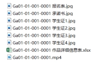 的电子版文件,内容包括:作品文件以及报名表、承诺书、所有作者的学生证拍图、作品详细信息表(作品文件均以参赛编号命名,其他文件命名方式:参赛编号+报名表、参赛编号+承诺书、参赛编号+学生证1、参赛编号+学生证2、作品详细信息表,作品详细信息表格式见附件2) ,报名表和承诺书都需要电子签名,最后必须以zip或rar压缩包整理所有文件,文件命名为参赛编号,可参看下列图示举例: