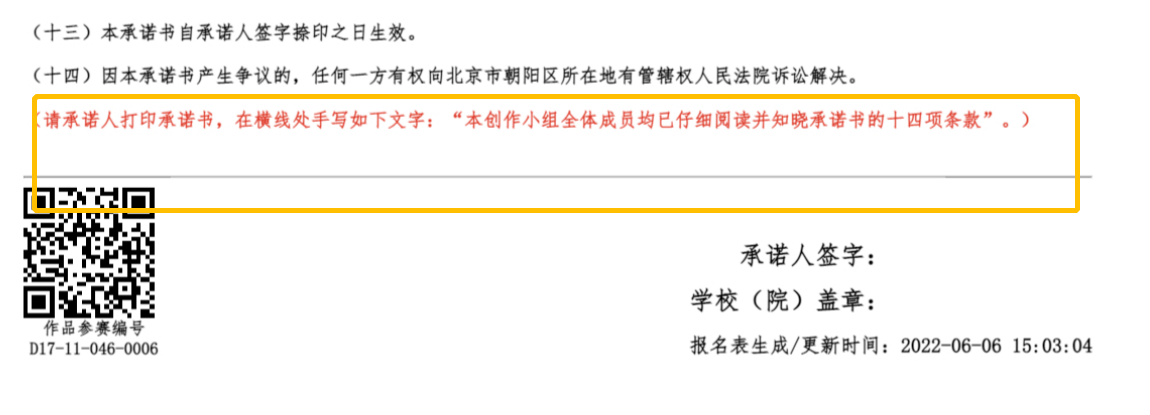 (2)纸质材料:纸质版学生报名表和承诺书各一份,并签字,且将对应的作品编号至纸质版报名表背面。此次纸质版材料只需要签字,无需盖章。