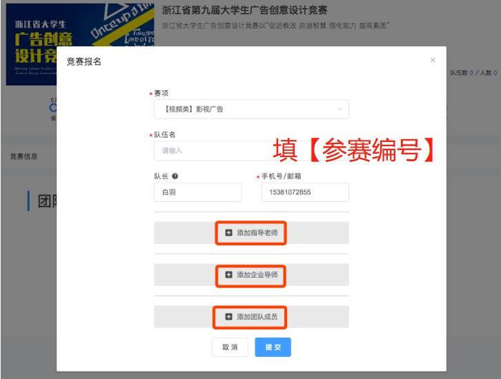 2.输入团队指导老师和参赛者信息时,姓名与手机号必须对应,可删除增加,人员顺序必须与报名表相一致,否则影响省赛获奖证书上人员排序。