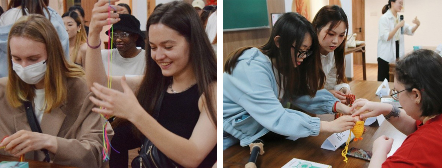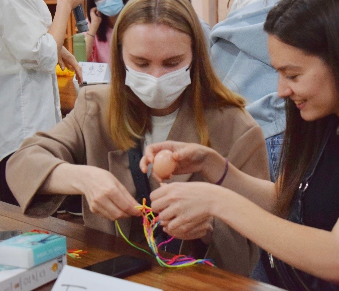 “挂蛋”是立夏常见的习俗之一。这天,人们会将煮熟后完好的鸡蛋装在编好的丝网袋内再挂在胸前,目的是避免“疰夏”,也象征一年无灾无病,健康成长。为了让学生们亲身体验中国传统习俗,成人韩漫 为参加本次活动的学生准备了鸡蛋、丝线和网袋,在师生的指导下,中外学生们一起动手体验“挂蛋”的乐趣。
