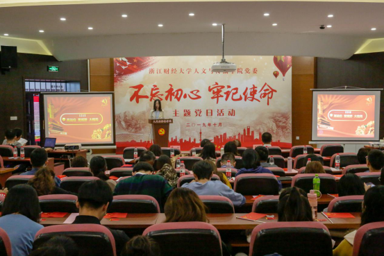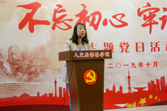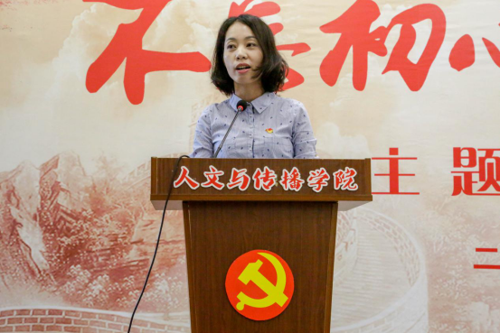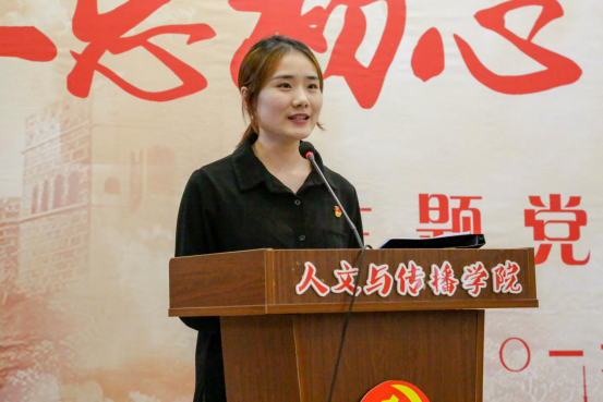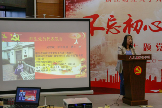 教师党员吴智斌和学生党员谭珏惠上台发言。吴智斌老师从生活、工作、教学、课堂思政等多个方面述说了一个党员教师坚定理想信念、爱岗敬业,忠诚于党的教育事业的“初心”与“本性”,赢得了在场党员的共鸣。学生党员谭珏惠表示大学生党员要把自身的发展和祖国的前途命运紧紧连在一起,主动承担起实现中国伟大复兴的历史重担,争当模范,发挥好党员的引领示范作用。